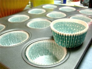 Preheat oven to 350 degrees, and prepare muffin tins with liners (these came in an adorable set from Barnes and Noble)