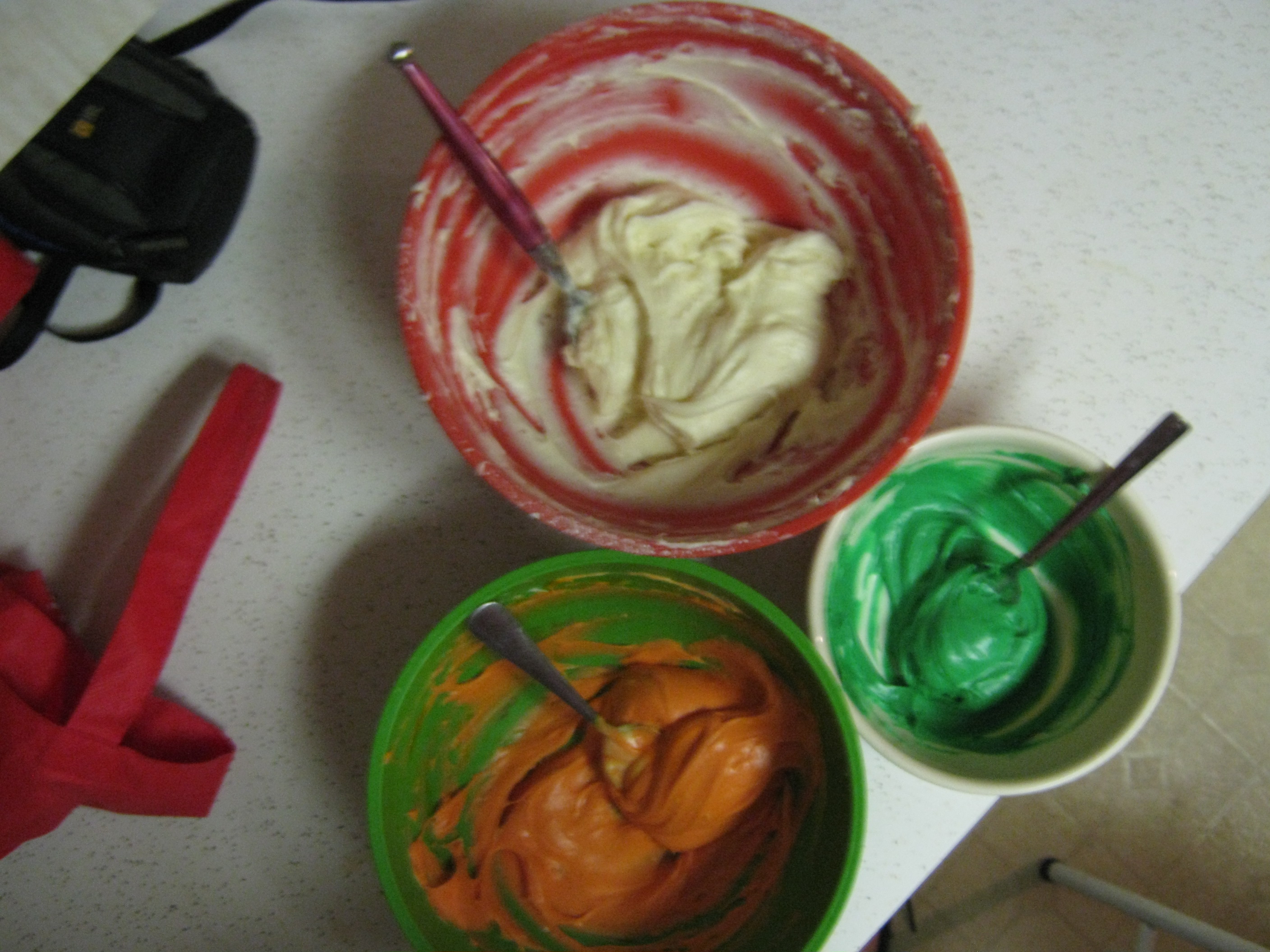 Divide your frosting into three bowls; one large and two small, with maybe ¾ cup frosting. Add red and yellow food dyes to one of the small bowls until you get an orange you like. Add green to the other small bowl.