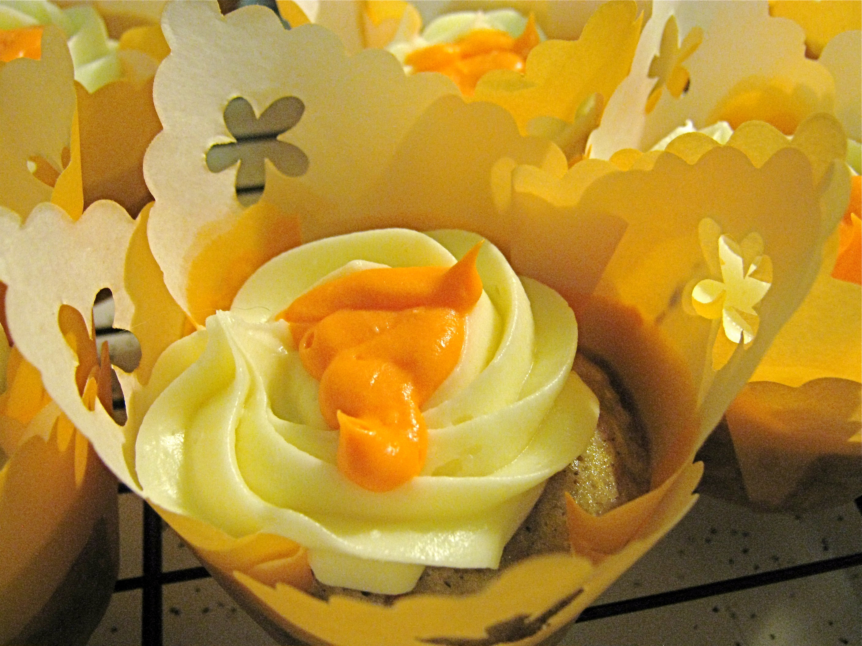 I can never watch Julie and Julia without migrating to the kitchen and baking while I watch. Seeing Julia in her Paris kitchen inspires me to close my eyes, forget about the hideous wood-panelling all around me, and dive into creating something pretty enough to be in that French kitchen. So, this chilly Sunday, I decided to brighten up the day with some carrot cake cupcakes.