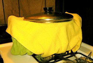 Ball the dough and rub it down with oil (I used olive oil). Cover it with a damp cloth (I used two and a pot lid) and place it somewhere warm to rise for an hour. Again, I placed it on my stovetop, in front of the oven vent.