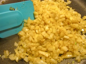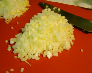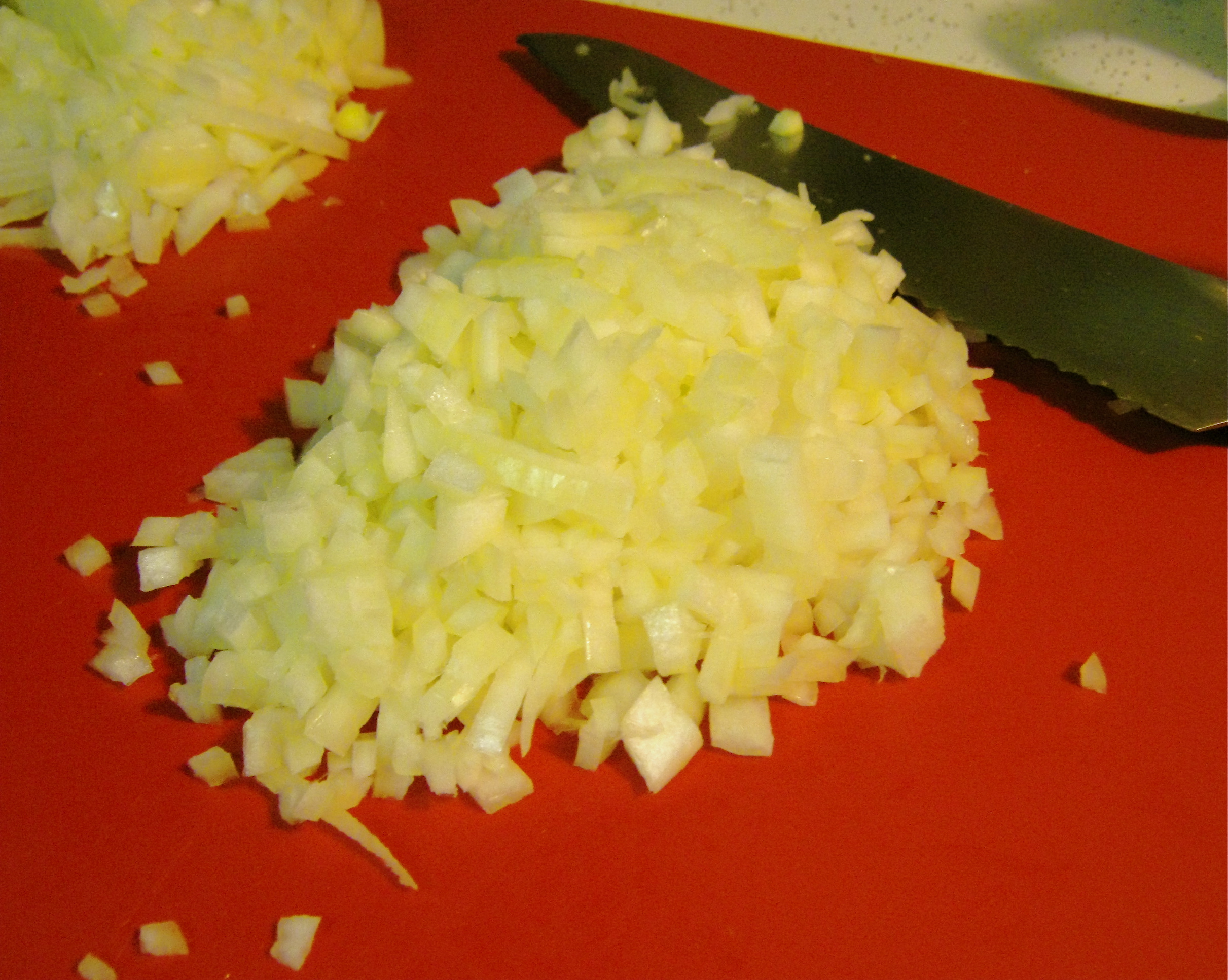 Mince the garlic and onions. The original recipe used a food processor, but I did it by hand.