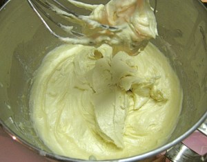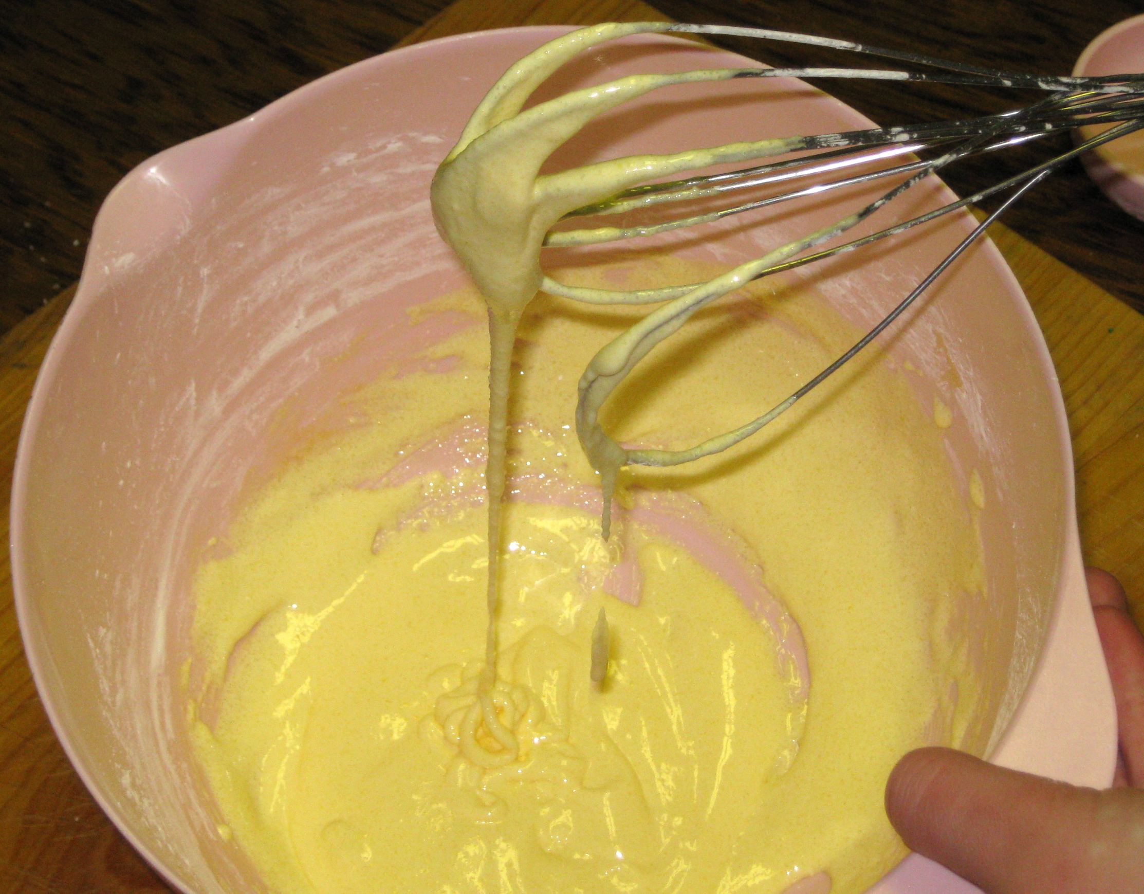 Mix together flour flour, baking powder, salt, and sugar. Add the butter, one tablespoon at a time; your mixture should be sandy. Add your eggs, one at a time, and beat until your batter is nice and fluffy.