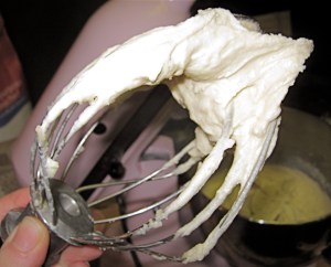 When your cream is ready, slowly pour it into the yolk mixture. Once combined, return to the saucepan and, still warming over medium heat, whisk your cream constantly until it thickens.