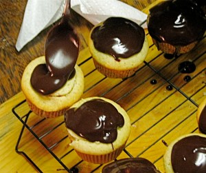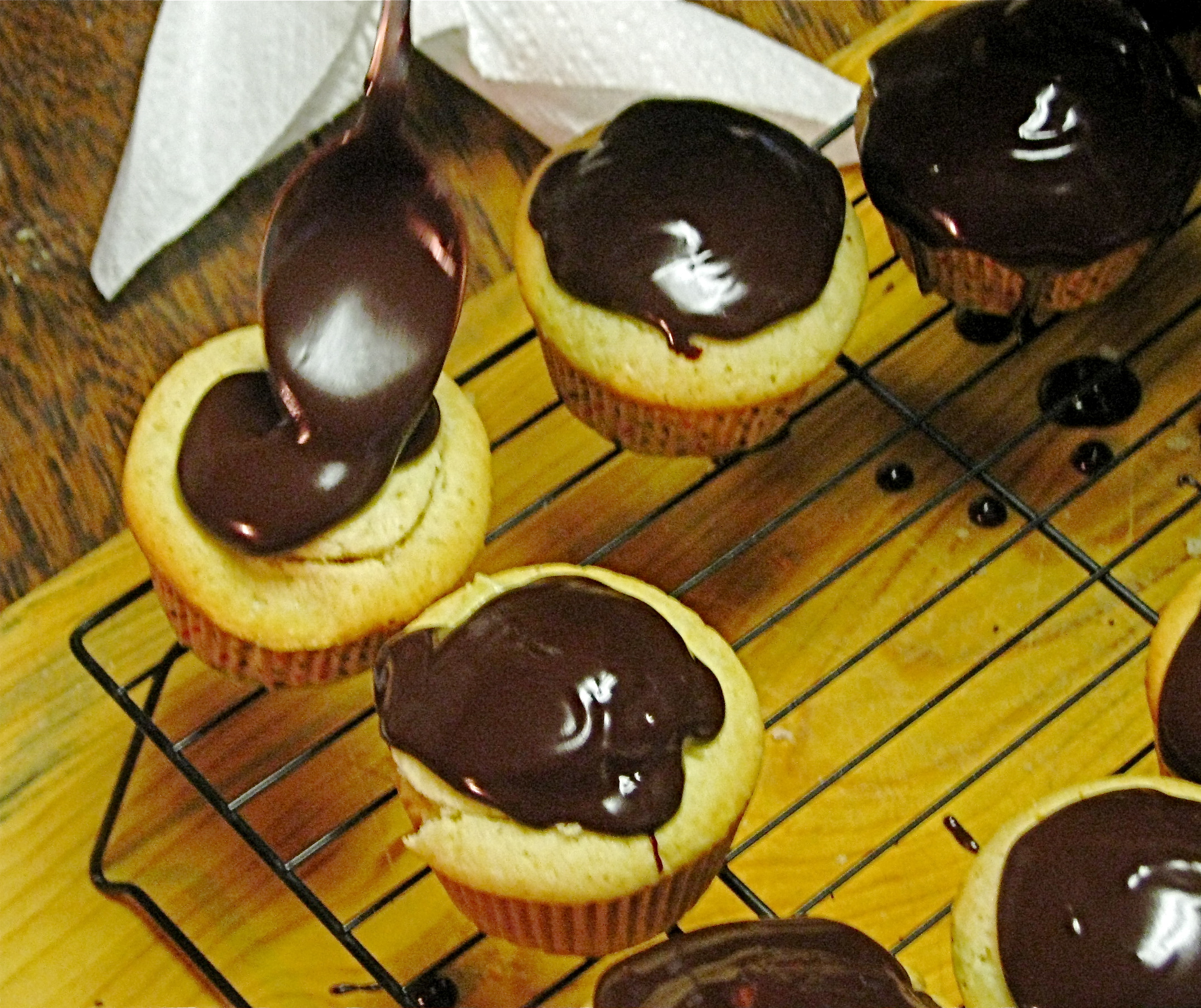 Carefully remove the cone; you’ll be re-inserting it. Fill a pasty bag with your cream, once it has set, and fill cupcake with cream. Cut the point off of your cone-bottom, and replace the cake-disk at the bottom of the cupcake. Make sure to be patient with yourself through this whole process!